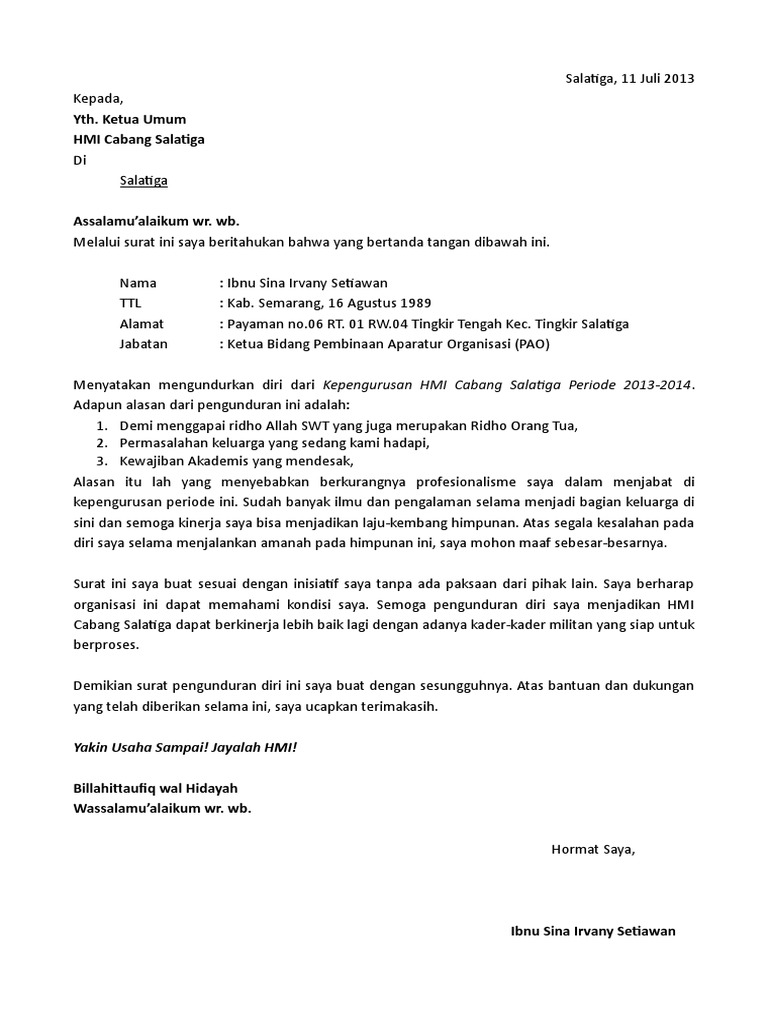 Gold mine tbk, karena faktor kesehatan yang sudah tidak. Contoh surat pengunduran diri dari organisasi himpunan mahasiswa jurusan universitas seksi humas berikut ini adalah contoh tentang contoh s. Namun jika anda ingin mengundurkan diri dari organisasi hmi, maka anda bisa melihat dan menggunakan contoh. Seperti pada contoh surat pengunduran diri diatas, anda dapat melihat bahwasanya alasan dari ia memutuskan untuk berhenti dari organisasi tersebut memanglah pantas. Terkadang ada banyak hal disaat kita bekerja di sebuah perusahaan atau instansi yang membuat kita.