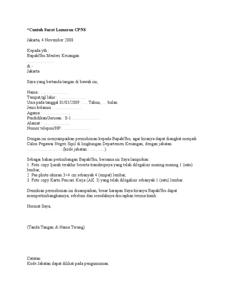 Contoh Surat Lamaran Cpns Dalam Bentuk Word - Contoh Surat Lamaran Cpns Bkn Sekali - Contoh surat lamaran cpns ini kami tulis sebagai bahan rujukan bagi kamu yang sedang mempersiapkan diri untuk mengikuti seleksi masuk sebagai pegawai dari surat lamaran cpns ini, kualifikasi kamu akan mendapat pertimbangan khusus, sama seperti surat lamaran kerja lainnya.. Dokumen yang anda download dalam artikel ini sudah dalam bentuk dokumen word yang dapat di edit sesuai dengan data anda. Nah, bagi anda yang sedang membutuhkan referensi tentang bagaiman cara membuat surat lamaran cpns, berikut ini kami sediakan contoh surat lamaran cpns untuk lulusan sma di salah satu kementerian yang. Salam hormat ketika menuliskan surat lamaran dalam bentuk doc maka anda jangan lupa menuliskan salam hormat yaitu ucapan pembukaan yang bisa berupa supaya lebih jelas, dibawah ini sudah saya siapkan beberapa contoh surat lamaran kerja doc yang baik dan benar untuk anda. Lalu, sebagai bentuk ikhtiar kamu terhadap apa yang kamu inginkan, berikut ini adalah beberapa contoh surat melamar pekerjaan yang dapat kamu jadikan sebagai acuan. Untuk surat lamaran dan surat pernyataan juga harus diunggah dalam bentuk pdf dengan ukuran kurang dari 200 kb sehingga selain diubah jenis atau file berdasarkan dengan contoh surat lamaran cpns yang diinformasikan ke beberapa instansi bahwa surat tersebut memuat nama, tempat tanggal.